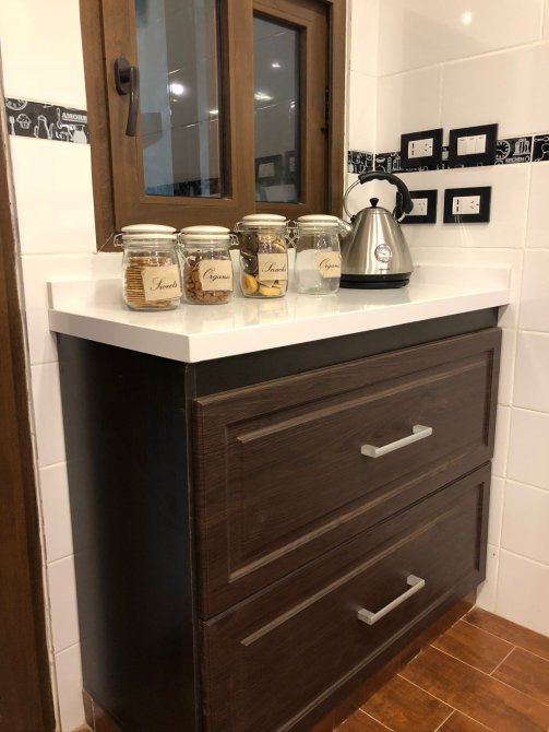 UN ESQUINERO DE SILESTONE PARA APARATOS ELÉCTRICOS DE COCINA CON CARGA DE CELULAR.