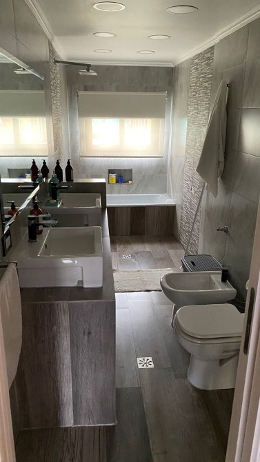 BAÑO AMPLIO CON DOS BACHAS, INODORO, BIDET, CUADRO DE DUCHA GRANDE Y BAÑERA,